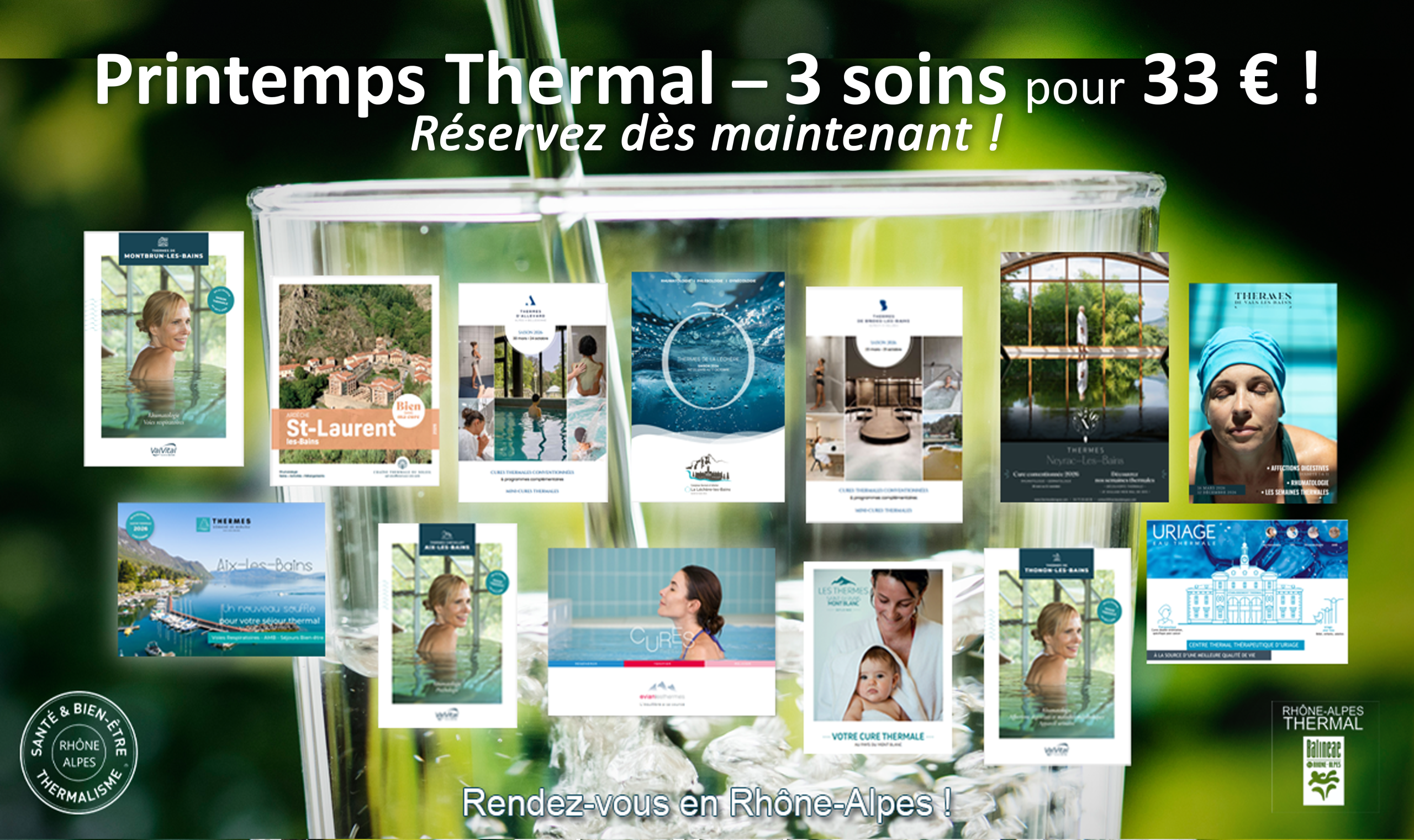 Printemps Thermal PRINTEMPS THERMAL soins 33 € . Allevard-les-Bains Profitez du Printemps Thermal du 18 au 23 mai 2026. Découvrez les bienfaits des soins thermaux : 3 soins pour seulement 33 € sur réservation. Offre exceptionnelle.