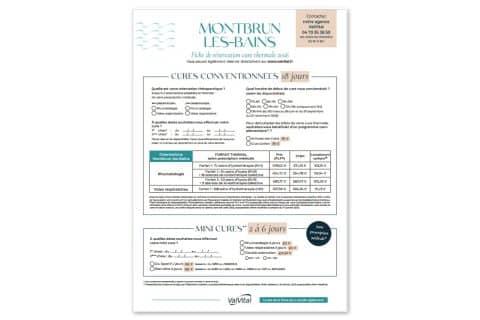 Montbrun-les-Bains Montbrun-les-BainsCures Montbrun-les-BainsMieux-être Montbrun-les-BainsStation Montbrun-les-Bains PRÉSENTATION Dans la Drôme Provençale sur les contreforts du Mont Ventoux, par son ensoleillement exceptionnel, son microclimat, son air pur et ses senteurs de Lavande, Montbrun-les-Bains est méditerranéenne. Cité comme l’un des cent plus beaux villages de France, Montbrun-les-Bains cultive son passé médiéval avec générosité. Station thermale et climatique, haut lieu touristique de la Drôme provençale, Montbrun-les-Bains est une bouffée d’air pur aux portes du Vaucluse. ORIENTATIONS THÉRAPEUTIQUES : DATES OUVERTURE 2026 Cures thermales médicales : 2 mars au 6 décembre 2026 Spa – Remise en forme : 2 mars au 6 décembre 2026 Je réserve ma CURE… RDV au SPA… HEBERGEMENTS… Contacts et Réservations Par courrierThermes Montbrun-les-Bains315 Route des Thermes26570 Montbrun-les-Bains Par téléphoneThermes : 04 75 28 80 75Réservation : 04 79 35 38 50 Par mailmontbrun@valvital.fr Sur le site internet :www.valvital.fr Brochures 2026 Montbrun Les Bains – Cures thermales 2026 Montbrun Les Bains – Bon Réservation Cure thermale 2026 Montbrun Les Bains – Spa thermal 2026 Explorez Montbrun-les-Bains ! SEJOUR à Montbrun-les-Bains, Drôme provençale Cures Montbrun-les-Bains FORFAIT Détente Thermale . 2 1/2 journées . Montbrun . 169 € 2 demi-journées : 4 soins du corps & Spa. Escale thermale en Drôme provençale dans l’un des plus beaux village de France. Montbrun-les-Bains au cœur des Baronnies. Mieux-être Montbrun-les-Bains