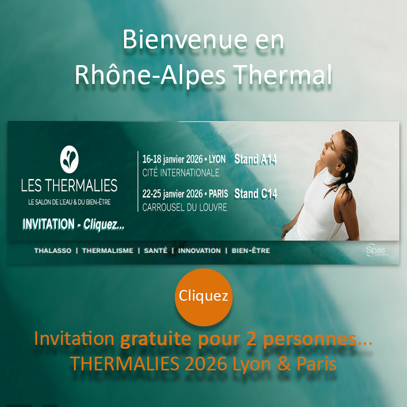 SALONS Les Thermalies Lyon & Paris 2026 InformationPresse Les Thermalies 2026 Lyon & Paris Retrouvez-nous aux salons LES THERMALIES 2026, pour une découverte immersive au cœur du thermalisme et du bien-être thermal avec les experts des stations thermales de Rhône-Alpes, sur l’Espace régional du Thermalisme Auvergne-Rhône-Alpes : 16 au 18 janvier 2026 à la Cité Internationale à Lyon, Stand A14 22 au 25 janvier 2026 au Carrousel du Louvre à Paris, Stand C14 RETIREZ VOTRE INVITATION GRATUITE… RENDEZ-VOUS A LYON ET/OU PARIS Plongez dans l’univers apaisant et ressourçant proposé par nos stations thermales, où la santé, la prévention et le mieux-être ne font qu’un. Les Thermalies sont l’occasion idéale pour vous aider à préparer votre séjour. Notre volonté est de vous informer pour préparer votre parenthèse de détente, découvrir les nouveautés en matière de thermalisme. Les experts des Thermes viennent à votre rencontre pour prendre soin de votre capital santé. Leur intérêt, vous rappeler le savoir-faire de la médecine thermale et les bienfaits d’un environnement naturel d’exception des stations de notre territoire. Consultez le calendrier 2026 des dates d’ouverture et l’offre globale thermale en feuilletant les brochures 2026. Que vous soyez un habitué des cures thermales ou que vous découvriez cet univers pour la première fois, notre rendez-vous aux Thermalies est l’opportunité pour répondre à toutes vos questions, vous dévoilez notre univers. Rencontrez les professionnels du thermalisme, explorez les tendances émergentes en matière de bien-être thermal, et plongez dans un monde où la prévention et la pleine santé sont à l’honneur. Les spécialistes des établissements thermaux vous aident à préparer votre court séjour avec un programme conjuguant soins thermaux et sessions de détente, activités physiques, ateliers de diététique, pour entretenir votre santé. CONFERENCES Thermalies Lyon 2026- PROGRAMME … CONFERENCES Thermalies Paris 2026 – PROGRAMME … LES THERMALIES 2026 sont bien plus qu’un salon ; c’est une véritable immersion dans le monde du thermalisme moderne. Retrouvez nos différentes stations thermales pour en apprendre davantage sur les soins thermaux et vous laissez guider par des experts qui mettent leur savoir-faire au service de votre mieux-être pour vivre mieux. RETIREZ VOTRE INVITATION GRATUITE… RENDEZ-VOUS A LYON ET/OU PARIS Destinations thermales Cure ou mini-cure santé, séjour thermal ou détente au spa : découvrez les 14 stations thermales sur notre territoire qui s’étend des Alpes, à la Drôme en passant par l’Ardèche… Calendrier Saison thermale 2026 Dates ouverture thermes & Spa thermaux 2026. Préparez votre prochain séjour thermal en Rhône-Alpes… Cures 18 jours, courts séjours, journée découverte thermale… Balineae by Rhône-Alpes Thermal. Brochures 2026 Toutes les Brochures 2026 à votre disposition pour préparer votre séjour thermal en Rhône-Alpes. JEU CONCOURS « Les Fêtes ensemble… Destination 2026 »Retour