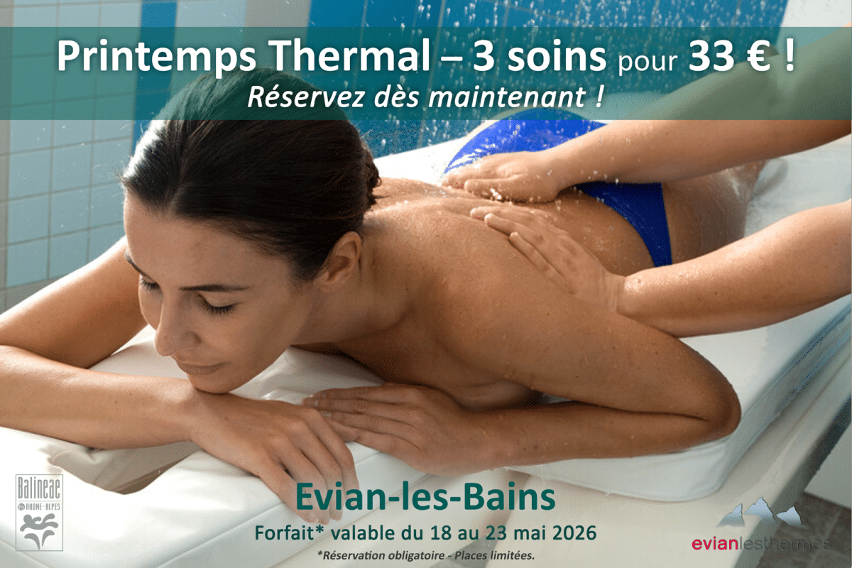 PRINTEMPS THERMAL . 3 soins 33 € . Evian-les-Bains En Haute-Savoie, au bord du Lac Léman, les Thermes d’Evian-les-Bains vous accueillent dans un cadre naturel verdoyant, où vous pourrez respirer l’air pur et vivifiant des Alpes. A Evian-les-Bains, quelle que soit la saison, les occasions ne manquent pas de découvrir une nature généreuse et authentique. Profitez des soins thermaux de l’eau minérale naturelle d’Evian. 💧Printemps Thermal : 3 soins pour 33 € | 18 au 23 mai 2026 Profitez du Printemps Thermal pour expérimenter les soins thermaux grâce à cette offre exceptionnelle ! Du 18 au 23 mai 2026, initiez-vous aux bienfaits des soins thermaux avec 3 soins pour seulement 33 €. Une opportunité unique de tester le savoir-faire thermal dans un cadre privilégié et apaisant. Réservez dès maintenant et laissez-vous envelopper par les vertus des soins à l’eau thermale. Places limitées, sur réservation uniquement ! Les Thermes Evian-les-Bains sont spécialisés en Rhumatologie ◦ Affections digestives ◦ Affections urinaires. 🌿Bienvenue pour le Printemps Thermal en Rhône-Alpes ! Forfait 3 soins thermaux : SOINS : 1 Douche sous immersion en piscine en eau thermale, 15′ 1 Bain hydromassant, 10′ 1 Douche sous affusion, 10′ OFFERT en supplément du forfait 3 soins : Accès au hammam, sauna, salle de repos. ACCES : Soins réservables uniquement l’après-midi à partir de 13h30 Forfait* : 33.00 € Réservation 04 50 75 02 30 *Offre exceptionnelle, valable du mardi 18 au samedi 23 mai 2026. Réservation préalable obligatoire. Un peignoir, une serviette de bain et des chaussons vous seront fournis pour les soins. Veuillez vous présenter 30′ avant votre rendez-vous. ©Photos Jérôme Mondière BROCHURES… Evian-les-Bains – Espace Fitness 2026 Evian-les-Bains – Cures thermales 2026 Evian-les-Bains – Wellness 2026 SEJOUR à Evian-les-Bains, Haute-Savoie… Mieux-être Evian-les-Bains Evian-les-Bains En Haute-Savoie, au bord du Lac Léman, les Thermes d’Evian-les-Bains vous accueillent dans un cadre naturel verdoyant, où vous pourrez respirer l’air pur et vivifiant des Alpes. A Evian-les-Bains, quelle que soit la… Station Evian-les-Bains Visite en images PRINTEMPS THERMAL . 3 soins 33 € . Brides-les-BainsRetour