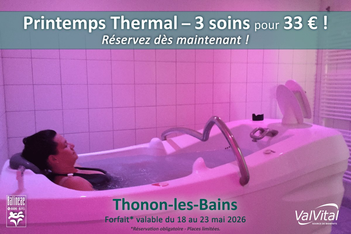 PRINTEMPS THERMAL . 3 soins 33 € . Thonon-les-Bains Située au pied des Alpes, Haute-Savoie, sur la rive française du Léman, la station thermale de Thonon-les-Bains combine en toute harmonie les bienfaits de la montagne et les plaisirs balnéaires.Les Thermes de Thonon-les-Bains sont un havre au cœur d’un parc où se côtoient séquoias, châtaigniers et cèdres. Les Thermes disposent d’un Spa thermal de 600 m², doté d’équipements de confort et de qualité et d’une résidence intégrée, la Villa Thermae. 💧Printemps Thermal : 3 soins pour 33 € | 18 au 23 mai 2026 Profitez du Printemps Thermal pour expérimenter les soins thermaux grâce à cette offre exceptionnelle ! Du 18 au 23 mai 2026, initiez-vous aux bienfaits des soins thermaux avec 3 soins pour seulement 33 €. Une opportunité unique de tester le savoir-faire thermal dans un cadre privilégié et apaisant. Réservez dès maintenant et laissez-vous envelopper par les vertus des soins à l’eau thermale. Places limitées, sur réservation uniquement ! Les Thermes de Thonon-les-Bains sont spécialisés en Rhumatologie ◦ Affections digestives ◦ Affections urinaires. 🌿Bienvenue pour le Printemps Thermal en Rhône-Alpes ! Forfait 3 soins thermaux : SOINS : 1 douche pénétrante 1 Bain hydromassant 1 douche au jet Forfait* : 33.00 € Réservation : 04 50 26 17 22 *Offre exceptionnelle, valable du lundi 18 au samedi 23 mai 2026. Réservation préalable obligatoire. *Accès aux soins autorisé à partir de 16 ans. Port du maillot de bain (short de bain, bermuda, tankinis, combinaison intégrale sont interdits), bonnet de bain et sandales réservés exclusivement aux soins, obligatoires. BROCHURE 2025… Thonon Les Bains – Spa thermal 2026 Thonon Les Bains – Réservation Cure thermale 2026 Thonon Les Bains – Cures thermales 2026 ©Photos : Jérôme Mondière, S. Fournier Vonderscher SEJOUR à Thonon-les-Bains, Haute-Savoie… Station Thonon-les-Bains Thonon-les-Bains En Haute-Savoie, au pied des Alpes et sur la rive française du Léman et située à proximité de la Suisse, Thonon-les-Bains combine en toute harmonie les bienfaits de la montagne… Cures Thonon-les-Bains PRINTEMPS THERMAL soins 33 € . Allevard-les-BainsRetourPRINTEMPS THERMAL . 3 soins 33 € . Uriage-les-Bains
