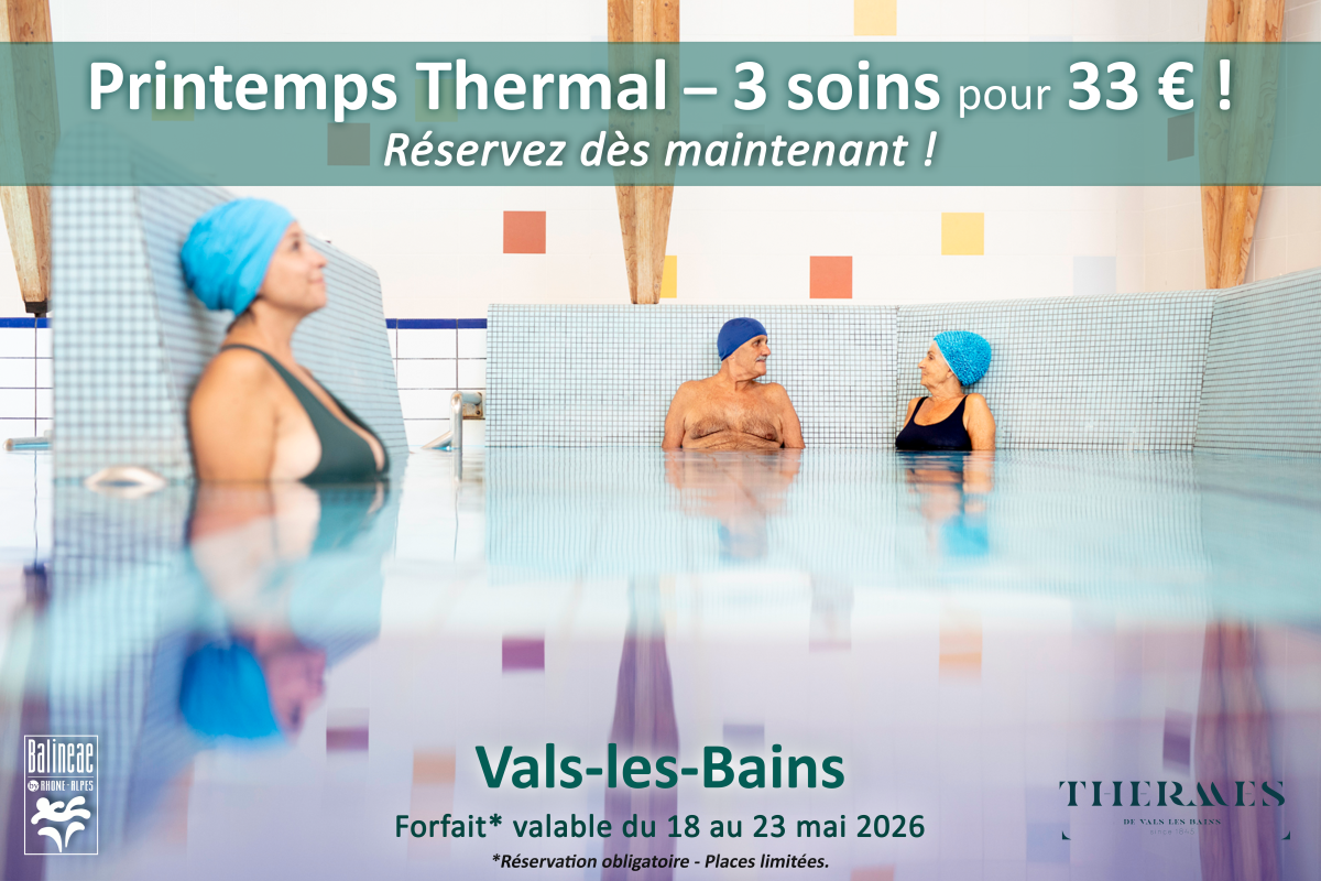 PRINTEMPS THERMAL . 3 soins 33 € . Vals-les-Bains Les Thermes de Vals-les-Bains vous accueillent dans un cadre paisible et verdoyant. Profitez d’un moment d’exception au cœur de l’Ardèche méridionale, le temps d’une parenthèse bienfaisante. Pétillante au cœur des jeunes volcans d’Ardèche, la station thermale de Vals-les-Bains jouit d’une belle renommée aussi bien en ce qui concerne son thermalisme, la chaleur de son accueil, la diversité de ses activités ou encore de la beauté de ses paysages sauvages et authentiques des Cévennes et de la Provence. 💧Printemps Thermal : 3 soins pour 33 € | 18 au 23 mai 2026 Profitez du Printemps Thermal pour expérimenter les soins thermaux grâce à cette offre exceptionnelle ! Du 18 au 23 mai 2026, initiez-vous aux bienfaits des soins thermaux avec 3 soins pour seulement 33 €. Une opportunité unique de tester le savoir-faire thermal dans un cadre privilégié et apaisant. Réservez dès maintenant et laissez-vous envelopper par les vertus des soins à l’eau thermale. Places limitées, sur réservation uniquement ! Les Thermes Vals-les-Bains sont spécialisés en Affections digestives ◦ Rhumatologie. 🌿Bienvenue pour le Printemps Thermal en Rhône-Alpes ! Forfait 3 soins thermaux, aux Thermes : SOINS : 1 Cataplasme 1 Douche générale 1 Douche pénétrante Forfait* : 33.00 € Réservation 04 75 37 46 68 *Offre exceptionnelle, valable du lundi 18 au samedi 23 mai 2026. Réservation préalable obligatoire. Photos ©M NIELS BROCHURES : Stations Thermales Pleine Santé – 2026 Vals-les-Bains – Spa thermal 2026 Vals-les-Bains – Cures thermales 2026 SEJOUR à Vals-les-Bains, Ardèche méridionale : Mieux-être Vals-les-Bains Station Vals-les-Bains Vals-les-Bains Pétillant au cœur des jeunes volcans d’Ardèche, Vals-les-Bains jouit d’une belle renommée aussi bien en ce qui concerne son thermalisme, la chaleur de son accueil, la diversité des ses activités ou encore la… PRINTEMPS THERMAL . 3 soins 33 € . Saint-Gervais Mont BlancRetour